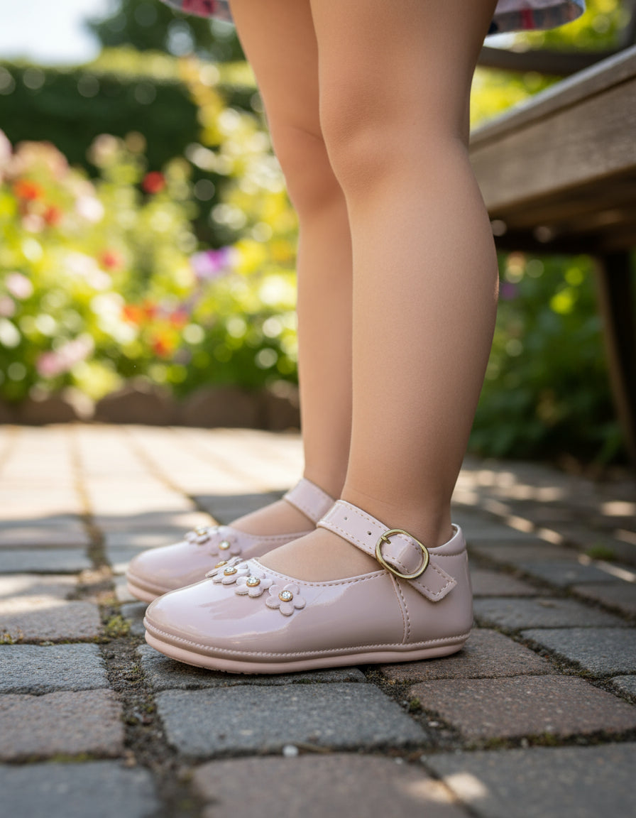 Sandalia Infantil Mirruña Perla Charol Decoración De Flores